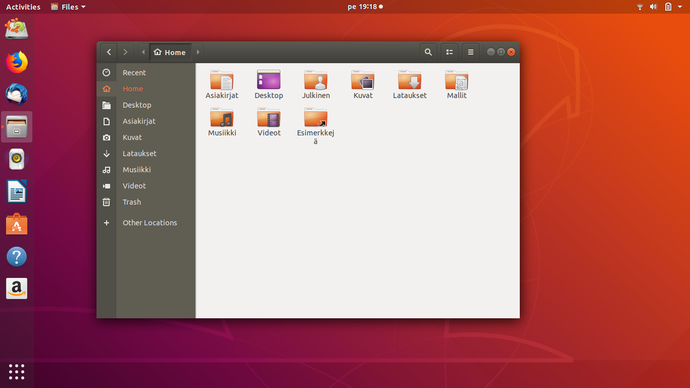 Ubuntun tiedostonhallinta aukeaa vasemman reunan palkin kuvakkeesta, sillä voi selata hakemistoja ja avata, siirtää sekä kopioida tiedostoja.