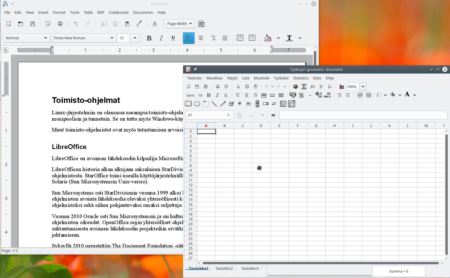 Gnome-officen tekstinkäsittelyohjelma Abiword ja taulukkolaskentaohjelma Gnumeric